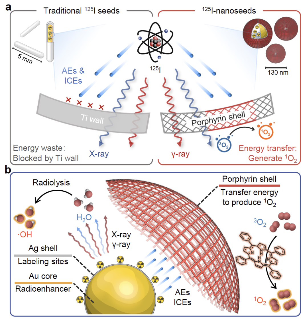精准化、个性化的内照射放疗是放疗发展的趋势。近距离放疗是内照射放疗的一种,通过将放射源精准植入肿瘤区域,利用放射性核素衰变持续产生的电离辐射从内部杀伤肿瘤。在临床实践中,用钛壁密封的碘-125粒子是近距离放疗常用的放射源,能够持续释放27.4-31.4 keV的X射线和γ射线(组织中的有效半径为1.7 cm),在肿瘤部位递送极高的辐射剂量并降低对正常组织的损伤。虽然传统碘-125粒子对单个小肿瘤具有良好的疗效,但随着肿瘤体积的增大和病灶个数的增加,碘-125粒子面临手术难度增加、治疗效果受限、免疫响应不足等挑战。