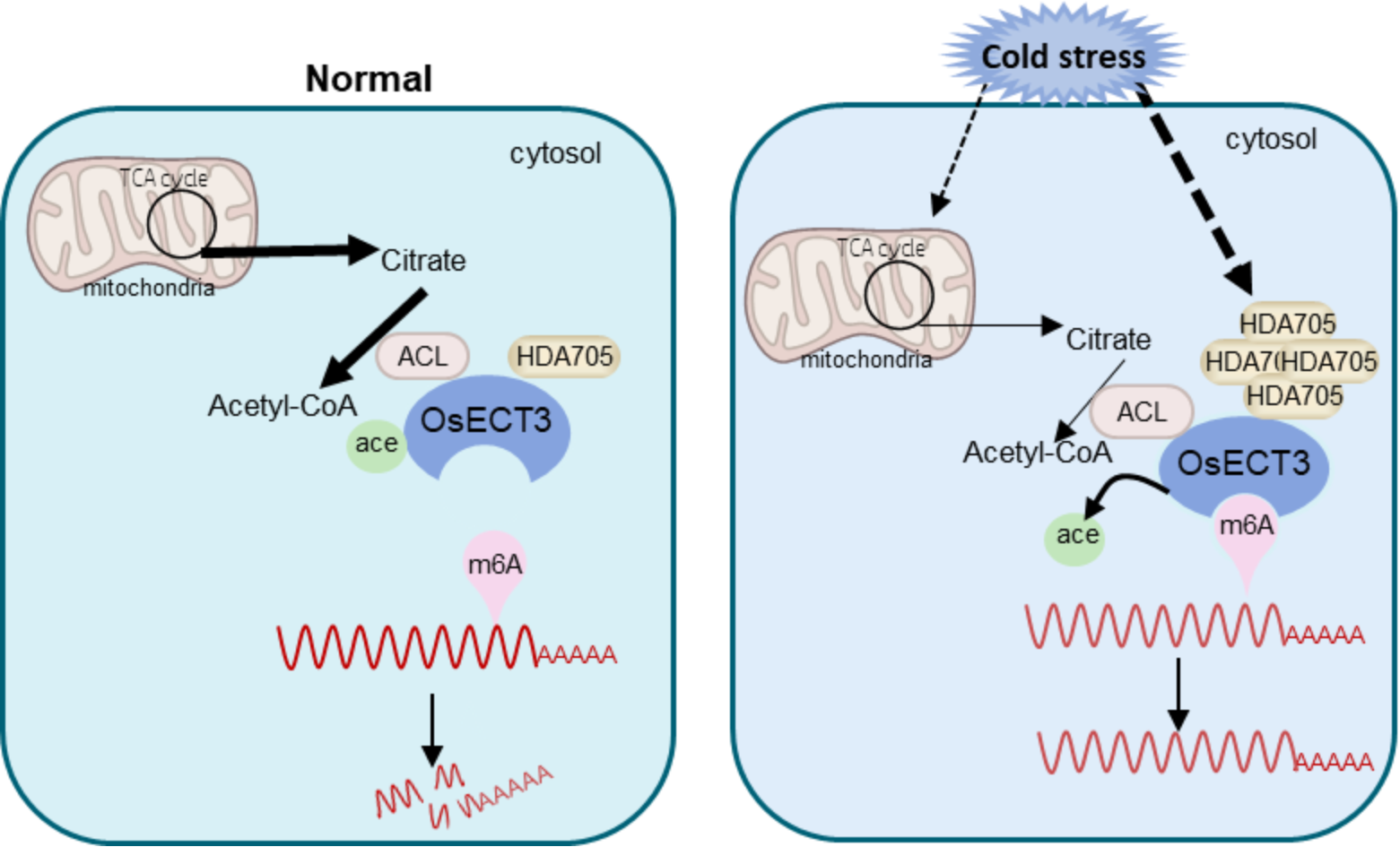 研究首次构建了赖氨酸乙酰化、代谢通路与m6A修饰之间的调控网络,揭示了mRNA修饰与蛋白质翻译后修饰在调控过程中的协同作用,体现了植物表观遗传调控机制的复杂性。该发现不仅为深入理解植物对环境胁迫的适应机制提供了新的理论框架,也为抗寒水稻品种的分子育种提供了潜在的靶点和全新思路,具有重要的科学意义与应用前景。