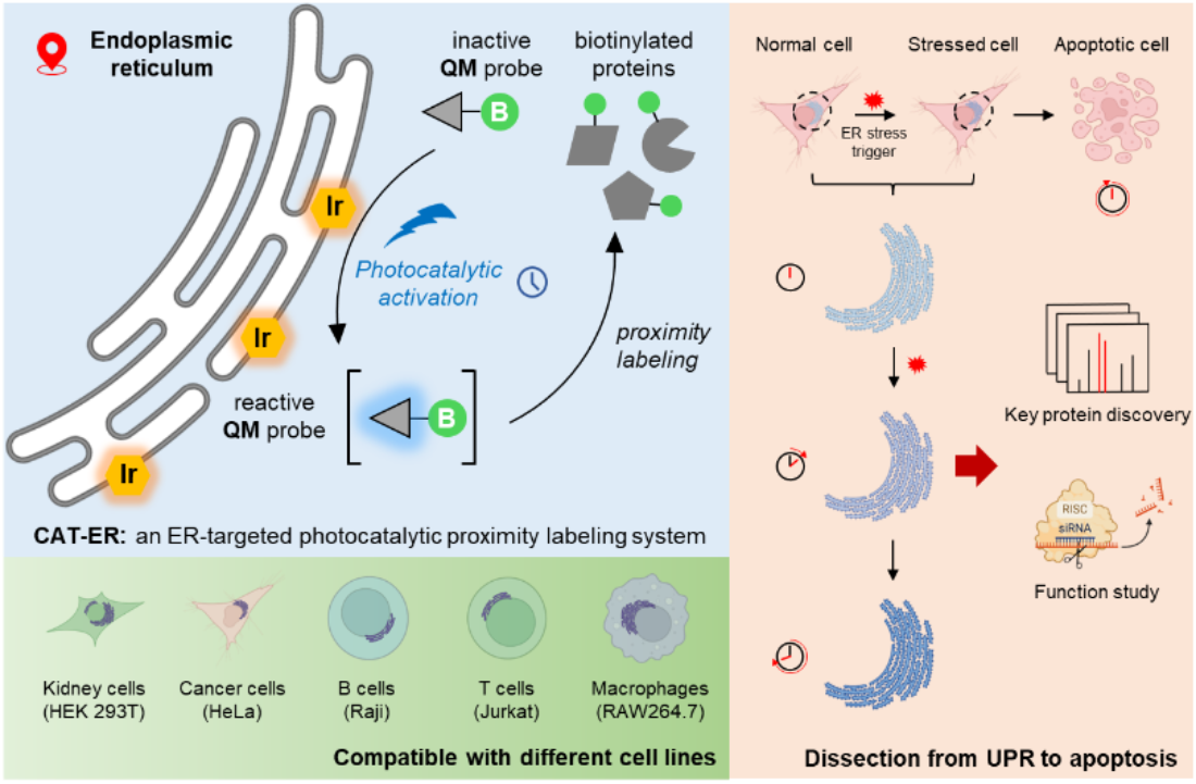 当前内质网蛋白组的研究主要依赖密度梯度离心等生化分离方法,但由于内质网膜系统的复杂性,常常发生胞器交叉污染,难以获得高纯度蛋白质组数据。新兴的酶促邻近标记技术(如APEX4、TurboID5)虽可实现内质网蛋白的原位捕获,但依赖转基因表达,限制了其在难转染体系中的应用,并且难以实现外源时间控制。