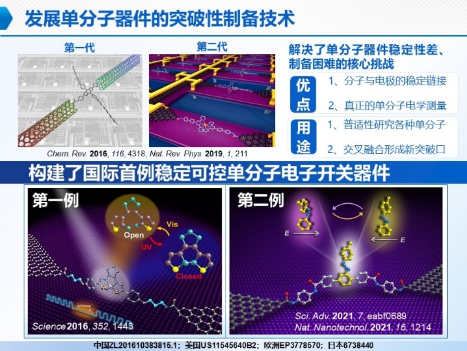 利用单个分子来构建功能光电子器件不仅有可能满足器件的微小化乃至高度集成的需求,也可为研究材料在分子水平上的本征物理化学现象和规律提供关键技术,是未来分子光电子器件研发的科学基础。针对分子电子器件中存在的接触界面相关的基本科学问题,郭雪峰教授带领的团队历经长期努力,建立和完善了制备稳定单分子器件的普适性方法,构建了国际首例稳定可控的单分子电子开关器件,发展了单分子电学检测的关键性技术,开拓了单分子科学研究的新方向。项目执行期间,共发表SCI论文165篇(其中影响因子大于10的有90余篇),5篇代表性论文分别发表在Science、Chem. Rev.、Nat. Rev. Phys.、Nat. Nanotechnol.和Sci. Adv.上,应邀出版专业书籍2本。研究成果受到国内外科学家的正面引用和积极评价,被Science, C&EN, Chemistry World、National Science Review、Chemistry World、中国科学报、中国科学基金和化学进展等杂志和媒体亮点报道50余次,成果入选“中国高等学校十大科技进展”“中国十大科学进展”。团队成员作为首席科学家或负责人分别承担了科技部重大研究计划项目和基金委重点、国家杰出青年科学基金、原创探索计划、国家重大科研仪器研制等项目。